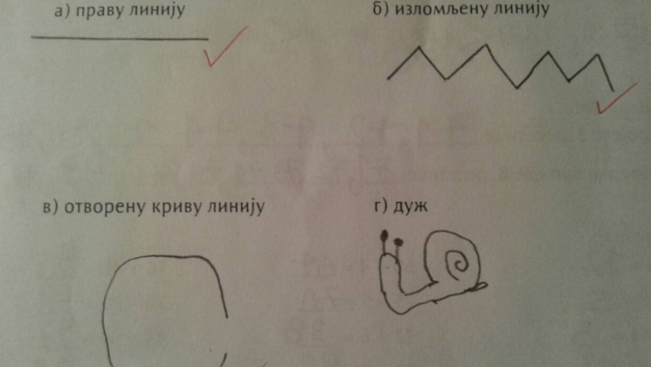 Prema zadatku, dete je trebalo da nacrta pravu, izlomljenu i otvorenu krivu liniju a na kraju i duž. Prva tri dela zadatka je dete odradilo perfektno a onda je došao red na duž i evo je: