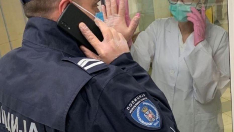 - Kolega iz Policijske uprave za Grad Beograd pozdravlja se sa suprugom koja je medicinska sestra na Urgentnom centru.