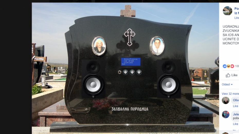 E, sad je hit, verovali ili ne, da ljudi počinju da ugrađuju zvučnike u nadgrobne spomenike! Čak se jedan takav oglas našao i u grupi na Fejsbuku pod nazivom "Pogrebna Oprema i Bela Tehnika Uvoz iz Nemačke".