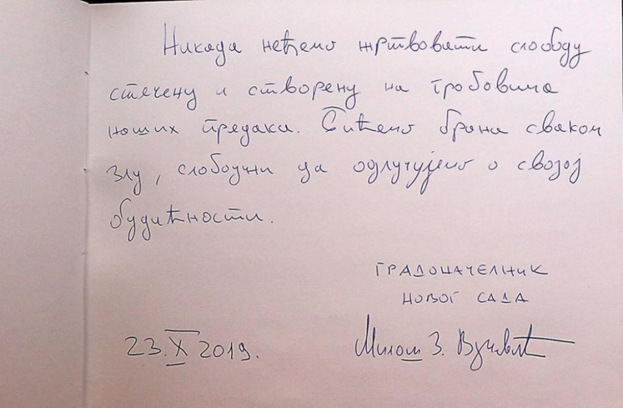 - Zahvaljujući pobedi, rekao bih dobra nad zlom, koja je izvojevana prilikom oslobođenja našeg grada 23. oktobra 1944. godine, mi danas možemo da živimo i uživamo u modernom i slobodnom Novom Sadu. Zato hvala svim hrabrim oslobodiocima, znanim i neznanim junacima, koji su tada izvojevali pobedu i omogućili Novom Sadu da dočeka da bude snažan univerzitetski centar, ovogodišnja Omladinska prestonica Evrope, a za dve godine Evropska prestonica kulture. Da nije bilo 23. oktobra 1944, ni mi danas ne bismo mogli da imamo grad kakav imamo, ni Novosađani ne bi mogli da stvaraju ono što su gradili zadnjih 75 godina. Naš grad je oslobođenje u Drugom svetskom ratu dočekao sa značajno malobrojnijim stanovništvom, čak za dve trećine manjim, i sa velikim stradanjima i gubicima, pre svega u ljudskim životima. Tada je Novi Sad imao stanovnika koliko danas ima studenata i to najbolje pokazuje koliko je grad napredovao, prvenstveno zahvaljujući onima koji su nam svojim životima podarili slobodu. Mi smo večno zahvalni svim oslobodiocima, kao i pripadnicima savezničkkih armija, pre svega Crvenoj armiji koja je učestvovala u oslobođenju Jugoslavije, samim tim i Novog Sada. Zato su ovaj datum i slobodarski duh zauvek utkani u tkivo Novog Sada, kao sećanje na neke prethodne generacije, i kao opomena za neke buduće. Mir i sloboda su neprocenjive vrednosti i nikome nećemo dozvoliti da ugrozi slobodu stečenu grobovima naših predaka. Uvek ćemo se svom snagom odupirati zlu, slobodni da odlučujemo o svojoj budućnosti, svesni odgovornosti koju imamo prema našim potomcima - rekao je gradonačelnik Novog Sada Miloš Vučević.