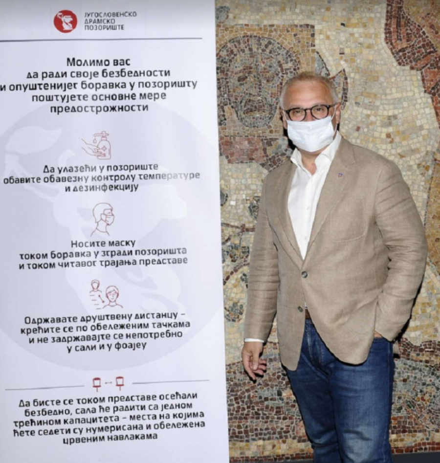 Kako je istakao, Jugoslovensko dramsko pozorište je preduzelo apsolutno sve mere zaštite, salu sa 600 mesta sveli su na 172 i primenjuju sve mere dezinfekcije koje su propisali epidemiolozi tako da su zaštitili posetioce, ali i glumce kako bi mogli bezbedno da igraju. Privatna arhiva