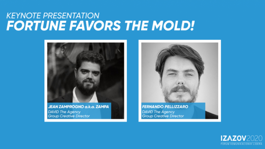 Glavne zvezde foruma IZAZOV 2020 su Fernando Pellizzaro a.k.a Zaro i Jean Zamprogno a.k.a Zampa, Group Creative Directors u agenciji DAVID The Agency Miami (USA). Tokom karijere osvojili su brojne međunarodne nagrade, uključujući 23 nagrade na Cannes Lions festivalu, od toga 7 zlatnih lavova, kao i nagrade D&AD, One Show, Clios… Oni su tim koji je osmislio i realizovao jednu od najzapaženijih kampanja za Burger King – The Moldy Whopper. The Drum proglasio ih je, ove godine, jednim od najcenjenijih i najnagrađivanijih globalnih kreativnih direktora. Oni će u velikom stilu zatvoriti ovogodišnji forum, a govoriće na temu “Fortune favors the mold!”