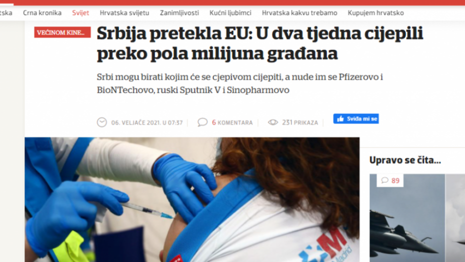 "Pretekli su EU, u dve nedelje vakcinisano više od pola miliona ljudi" Alo.rs/N.A. Vesti 2021-02-06 09:57:21 0 Srbija je postala evropski lider u vakcinaciji svog stanovništva. Printscreen Printscreen večernji, Foto: Printscreen BONUS VIDEO PROČITAJTE JOŠ: Tagovi vakcinacija Srbija Hrvatska Korona koronavirus korona virus društvo povezane vesti OGLASILO SE TUŽILAŠTVO Odloženo izricanje presude Brajanu Volšu 11:47 Hronika 0 IGRA SEZONU KARIJERE Bio je velika nada Zvezde, otišao za 1.200.000 evra, a sada se bori za titulu u komšiluku 11:45 EU popustila pod velikim pritiskom – ništa od zabrane benzinskih i dizel motora, evo detalja 11:42 MAMA MI DOLAZI ZA PRAZNIKE, A JA NEMAM NI DINARA! Kako da joj saopštim da mi je samo teret? 11:42 NOVA GEJ AFERA U ELITI? Filip Đukić u akciji sa ovim muškarcem, isplivao snimak poljupca! (VIDEO) 11:40 Vip 0