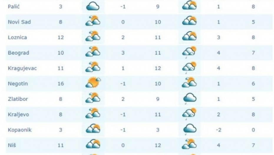 Najniža temperatura biće od minus tri do četiri, a najviša od osam do 13 stepeni. U Beogradu će u toku dana biti promenljivo oblačno, sunčano i suvo, a uveče i u toku noći povremeno kiša.