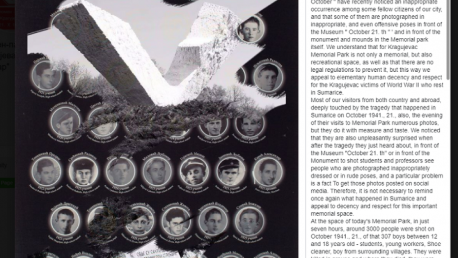 Zaposleni u Spomen-parku ''Kragujevački oktobar'' su u poslednje vreme primetili jednu neprimerenu pojavu među pojedinim sugrađanima našeg grada, a to je da se neki od njih fotografišu u neprikladnim, pa čak i uvredljivim pozama ispred Muzeja ''21. oktobar'' i ispred spomenika i humki u samom Memorijalnom parku. Razumemo da za Kragujevčane Spomen-park ne predstavlja samo memorijalni, već i rekreativni prostor, kao i da ne postoje zakonske regulative kojima bi smo to mogli da sprečimo, ali zato na ovaj način apelujemo na elementarnu ljudsku pristojnost i poštovanje prema kragujevačkim žrtvama Drugog svetskog rata koje počivaju u Šumaricama.