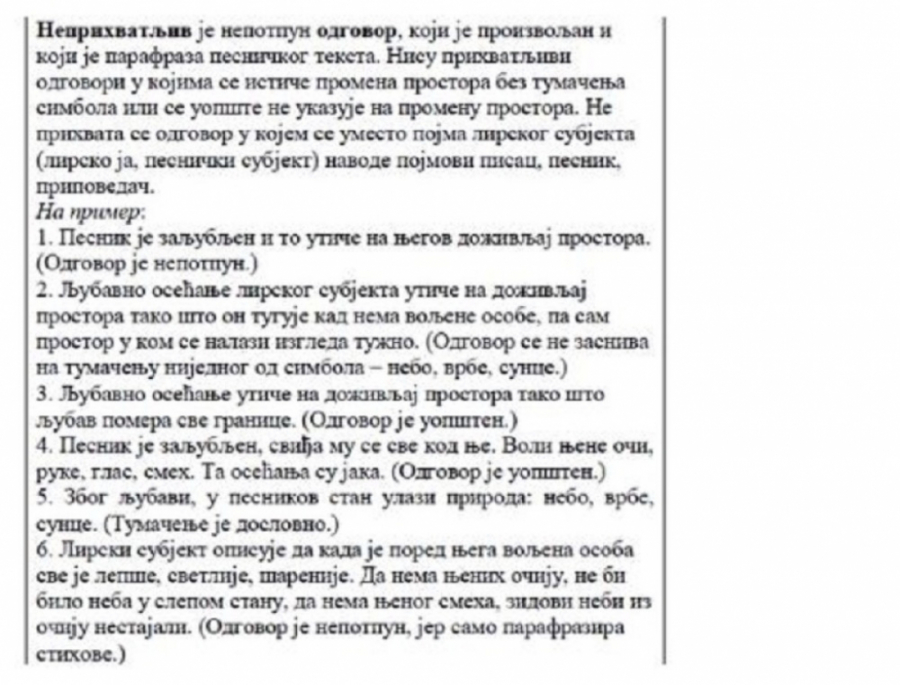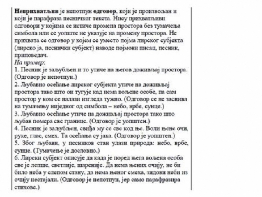- Tekst pitanja mi je bio nerazuman. Recimo, zadat nam je ljubavni tekst, a trebalo je da zaokružimo značenje, na primer, da li je osoba iz teksta ljubomorna, da li je srećna ili drugo. Ovaj test je bio mnogo lakši od probnog - zaključuje ipak.