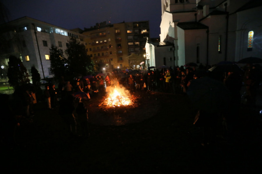 Uprkos kiši koja uporno pada od ranih jutarnjih časova, građani su se ipak okupili ispred Hrama Svetog Save, kako bi proslavili Badnje veče.