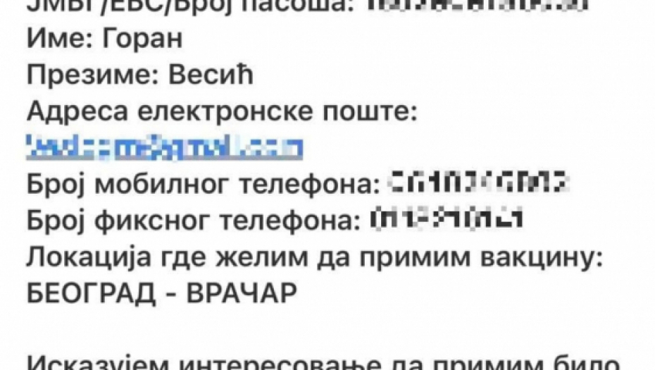 Zamenik gradonačelnika Beograda Goran Vesić je među prvim građanima koji su se prijavili da prime vakcinu protiv korona virusa. Vesić je podelio potvrdu svoje prijave, samo nekoliko časova nakon što je jutros na sajtu e-uprave otvorena mogućnost da se građani prijave za vakcinaciju protiv korona virusa.