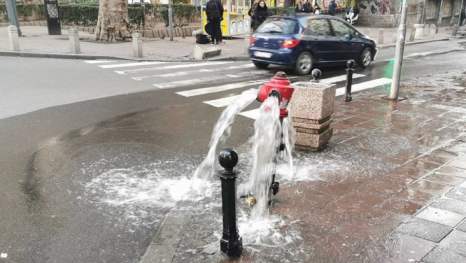 Jedan hidrant je pukao u Makedonskoj ulici, nedaleko od opštine Stari grad i autobuskog stajališta. Sugrađani prolaze i gledaju nestvaran prizor.