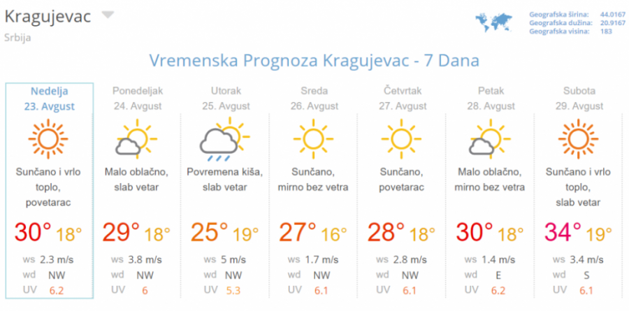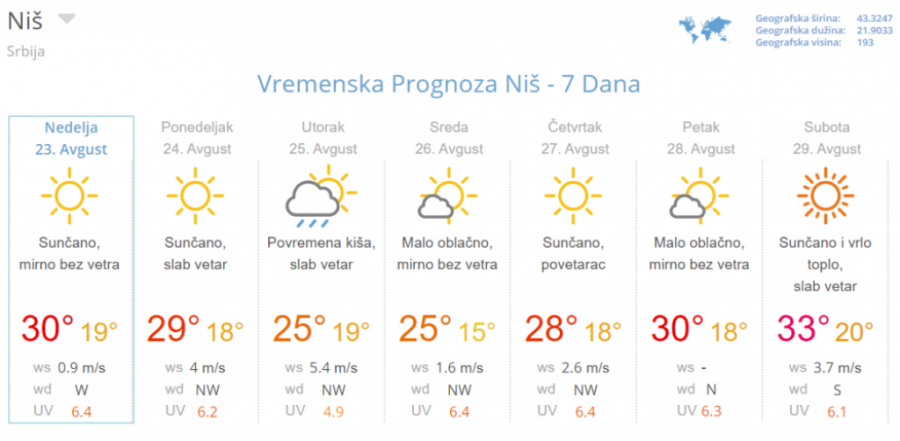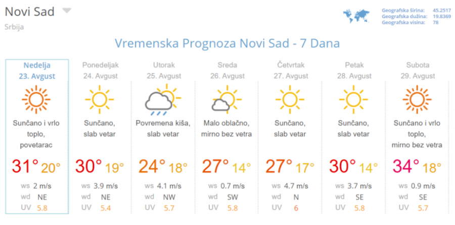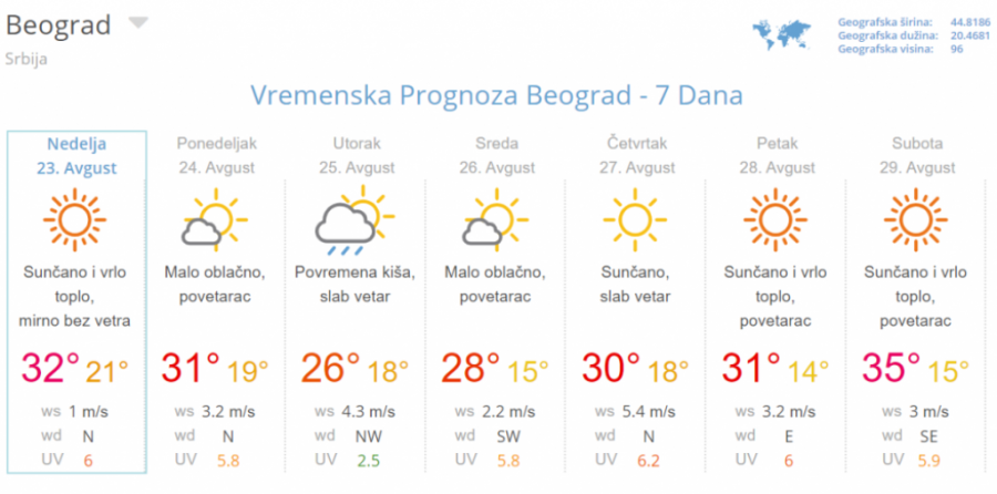 Zatim od srede do petka pretežno sunčano uz povrenenu umerenu oblačnost uglavnom suvo ali ne baš jako toplo, posebno što je u četvrtak moguć jedan manji prodor suvog i svežijeg vazduha sa severa.