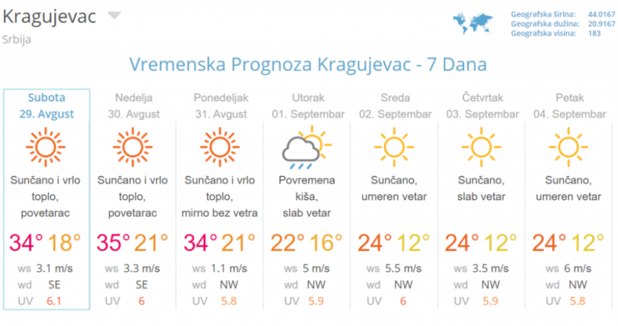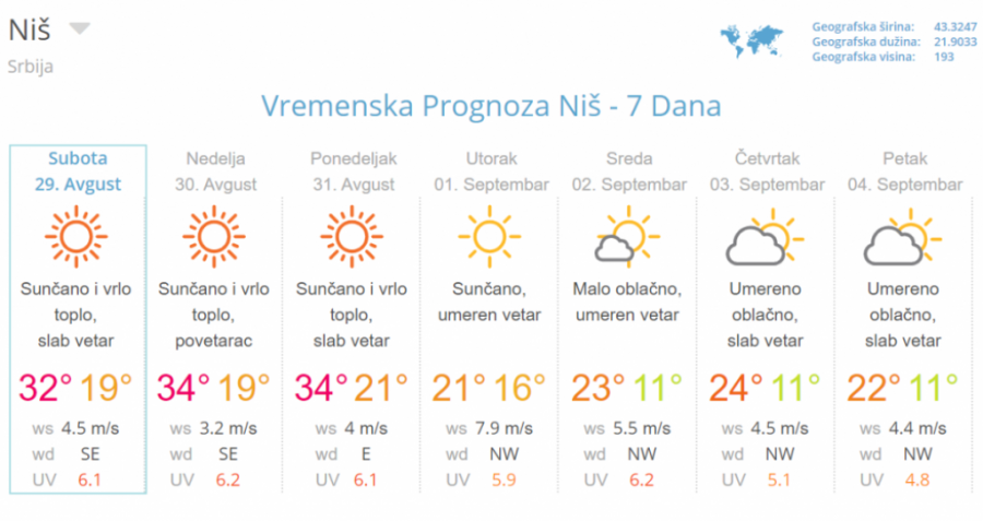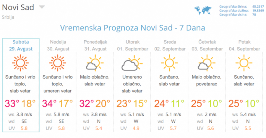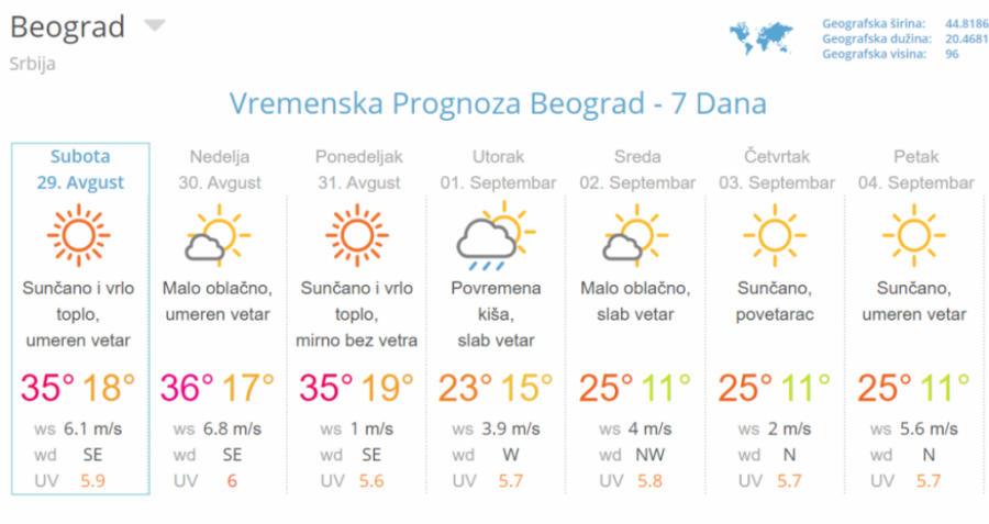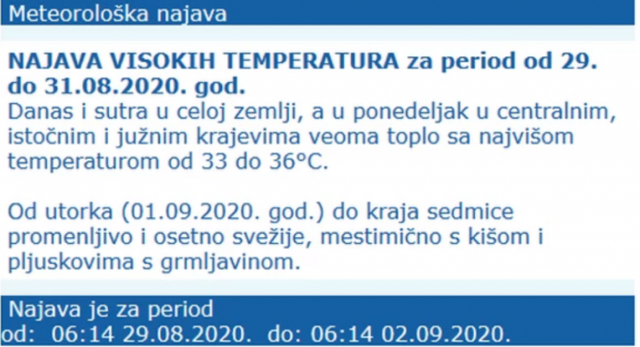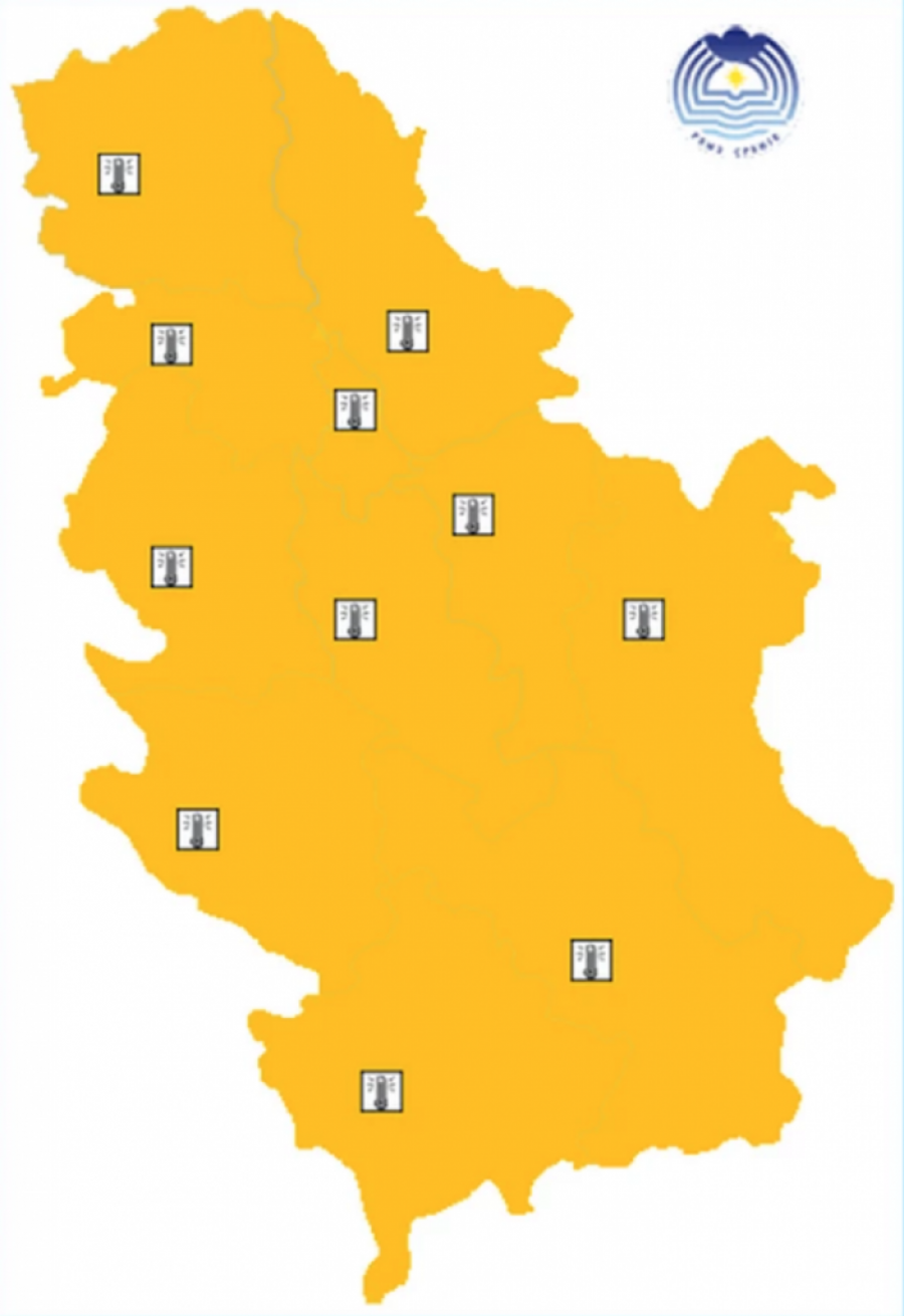 U Srbiji danas sunčano i tropski toplo. Duvaće slab do umeren južni i jugoistočni vetar, u košavskom području jak. Minimalna temperatura od 14 do 22°C, maksimalna dnevna od 33 do 37°C.
