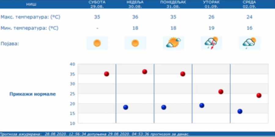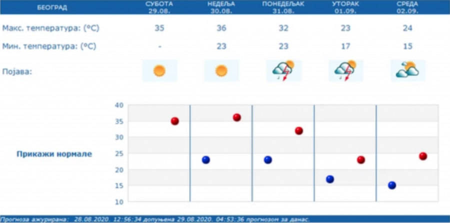 U Srbiji u ponedeljak sunčano i tropski toplo, dok se na severu i zapadu očekuje nešto svežije, ali i dalje toplo. Tokom dana u severnim i zapadnim predelima Srbije povećanje oblačnosti, ponegde i pojava lokalnih pljuskova sa grmljavijnom. U toku noći i u utorak jače naoblačenje sa kišom, pljuskovima i grmljavinom, a ponegde se očekuju i grmljavinske oluje. Maksimalna temperatura u ponedeljak od 28°C na severozapadu do 36°C na jugoistoku Srbije, a u utorak od 22°C na severu do 30°C na jugu i istoku Srbije. Sredinom sledeće sedmice umereno toplo, a u četvrtak naoblačenje sa kišom, pljuskovima i grmljavinom.