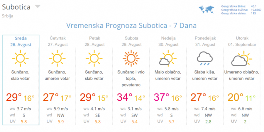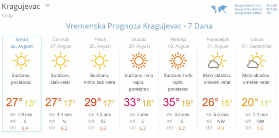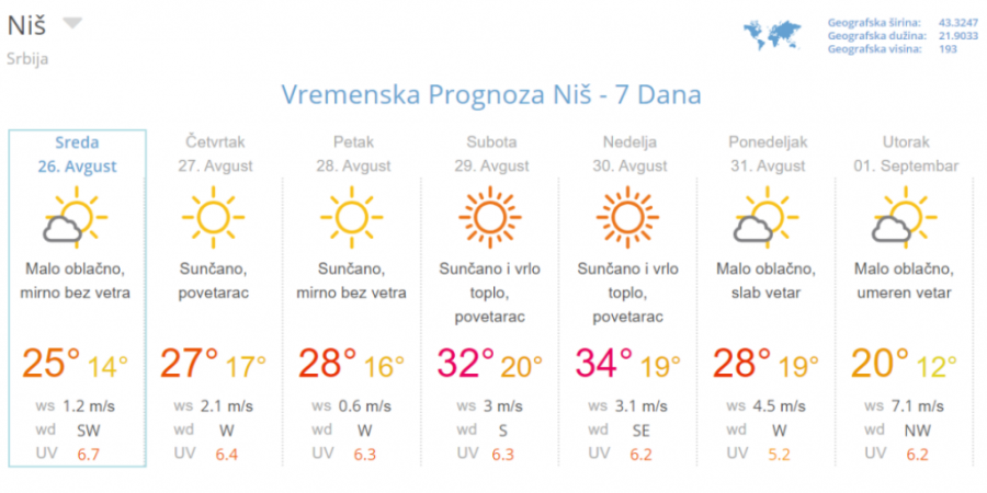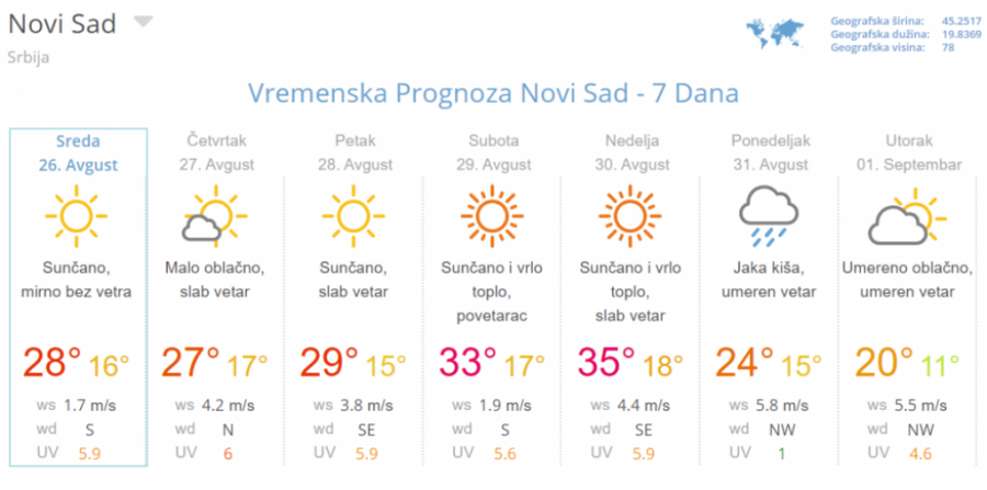U Srbiji u petak sunčano i toplo. Maksimalna temperatura od 30 do 33°C. Za vikend sunčano i tropski toplo, uz pojačane južne vetrove, naročito u nedelju, kada će u košavskom području i na planinama duvati jak južni vetar. Maksimalna temperatura u subotu u većini predela biće oko 35°C, a u nedelju od 34 do 37°C. U nedelju krajem dana i tokom noći na severu Srbije lokalni pljuskovi sa grmljavinom. Početkom sledeće sedmice osetno svežije, a u ponedeljak uz jače naoblačenje i uz kišu i pljuskove sa grmljavinom, a temperatura će biti u padu i za više od 10 stepeni. Biće uslova i za grmljavinske oluje sa gradom, olujnim vetrom i obilnim pljuskovima.