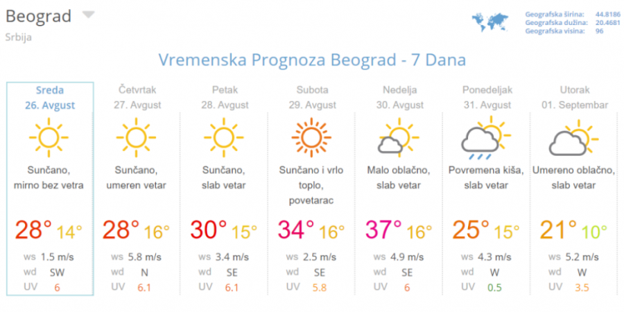U Beogradu danas pretežno sunčano i toplo. Duvaće umeren do pojačan severoistočni vetar, krajem dana u slabljenju. Minimalna temperatura 17°C, maksimalna dnevna 29°C.
