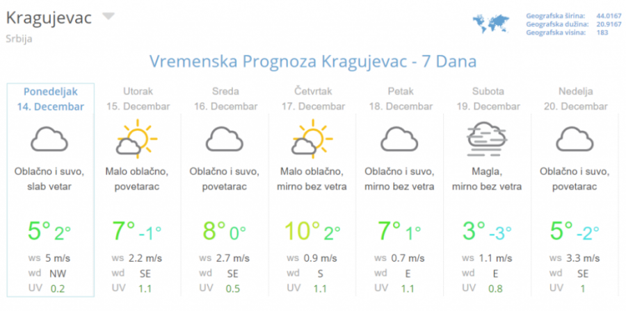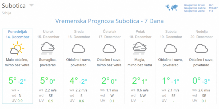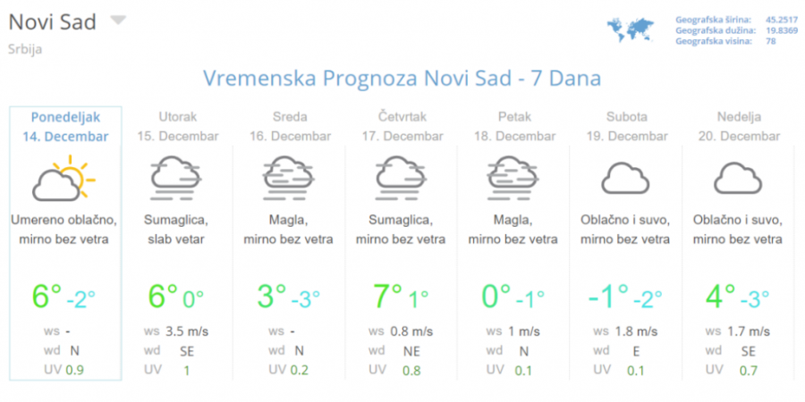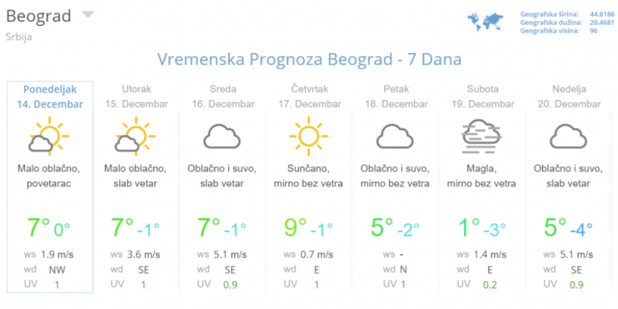 Od četvrtka će ponovo jačati anticiklon te će do 21. decembra dominirati stabilno i suvo, a u nizijama često maglovito i tmurno vreme. Vetar će uglavnom biti slab i promenjliv samo u sredu možda na kratko nešto jači južni, a zatim severozapadni.