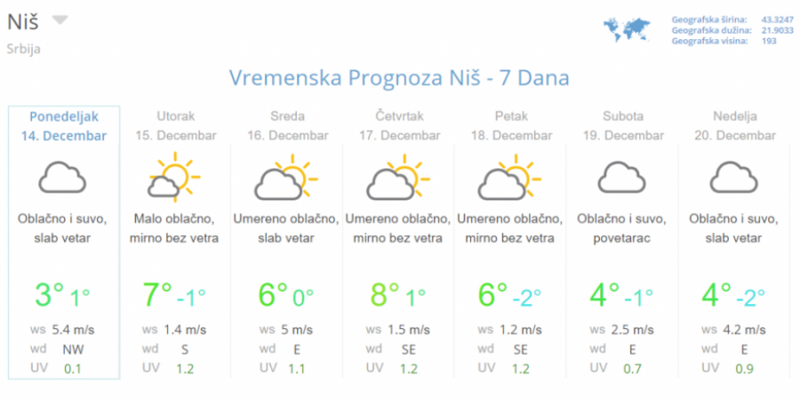 Sve do 21. decembra vremenske prilike na našim delom Evrope biće pod uticajem jakog anticiklna koji će podržavati suvo i stabilno vreme. U nizijama će često biti magle i niskih oblaka, dok će u planinskim predelima preovlađivati sunčano i toplo. Od dans će pojava uglavnom slabih jutarnjih mrazeva biti nešto češća nego prošlih dana. Jutarnji minimumi od -3 do 1 stepen Celzijusa, a dnevni maksimumi od 7 do 13 u predelima bez magle i do 5 stepeni Celzijusa u predelima sa maglom i niskim oblacima.