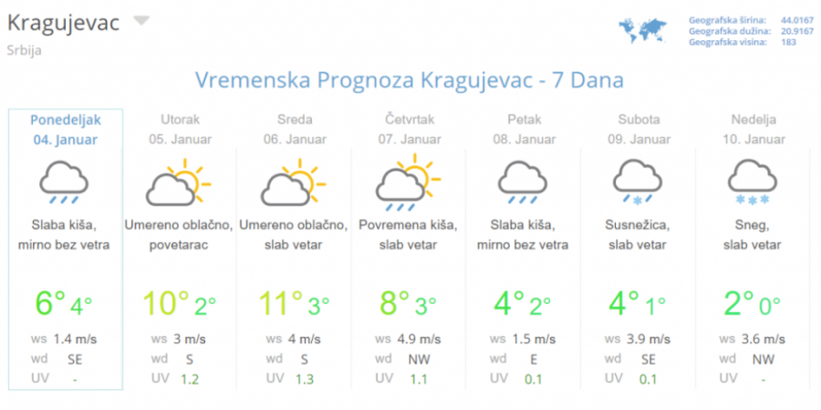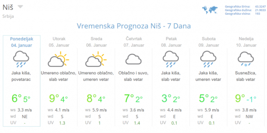 Danas umereno do znatno oblačno i uglavnom suvo, samo ponegde uz slabu kišu ili rosulju, dok je preko 900mnv moguće provejavanje snega. Vetar će biti slab do umeren, zapadni i severozapadni, a dnevni maksimum u manjem padu, ali i dalje iznad proseka.