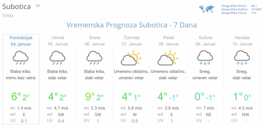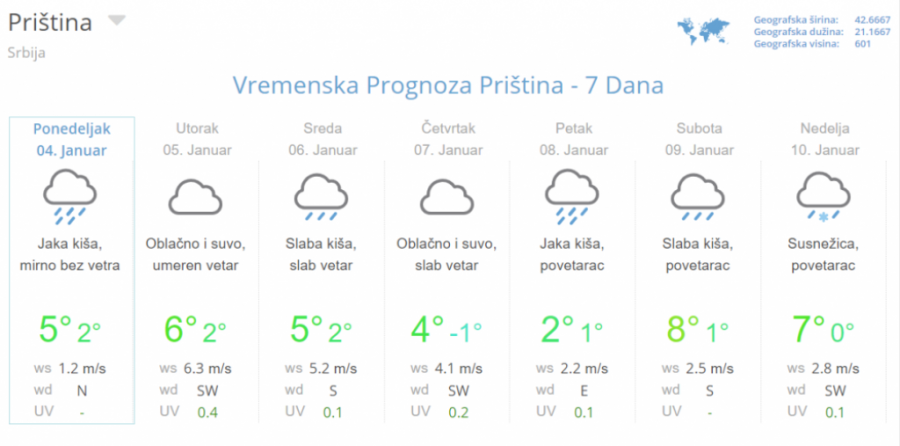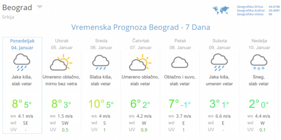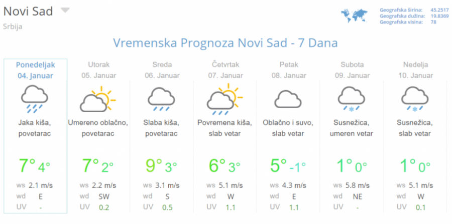 U tim uslovima ovog dana se očekuje jače naoblačenje sa kišom, duž Jadrana može biti i grmljavinskih pljuskova, dok se najmanje padavina očekuje na severoistoku regiona. Duž Jadrana će prolazno malo pojačati jugo, dok će i košava polazni biti u pojačanju, ali se olujni udari ne očekuju. Na zapadu regiona svežije uz severni vetar i maksimum oko 5, a na jugu i jugoistoku i do 12 stepeni Celzijusa. Tako da posle Božića po gregorijanskom kalendaru i doček ovog velikog praznika po julijanskom kalendaru bez pravog zimskog ugođaja.