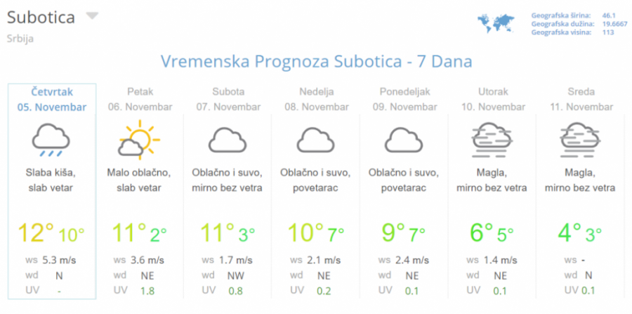 Danas pretežno oblačno, tmurno i još malo hladnije ponegde uz slabu kišu ili rosulju, ne očekuju se konkretne količine padavina. Vetar će okrenuti na severozapadni smer, a dnevni maksimum od 9 do 14 stepeni Celzijusa, toplije još samo na krajnjem jugu regiona.