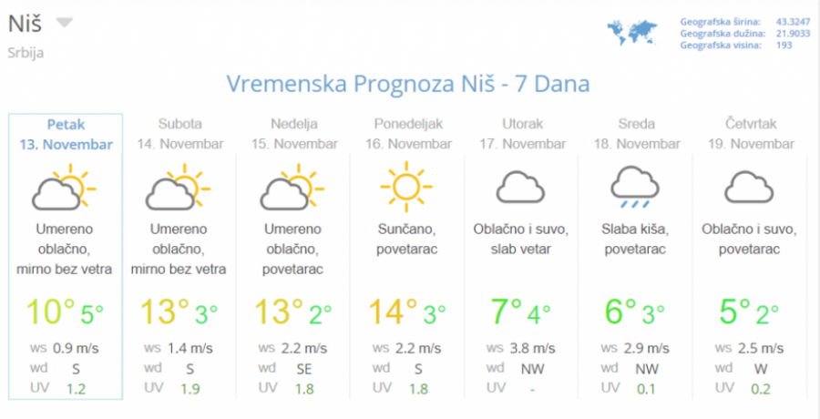 U utorak dnevni maksimum od oko 7 na severu do oko 14 stepeni Celzijusa na jugu regiona, na planinma preko 800mnv od 1 do 5 stepeni Celzijusa.