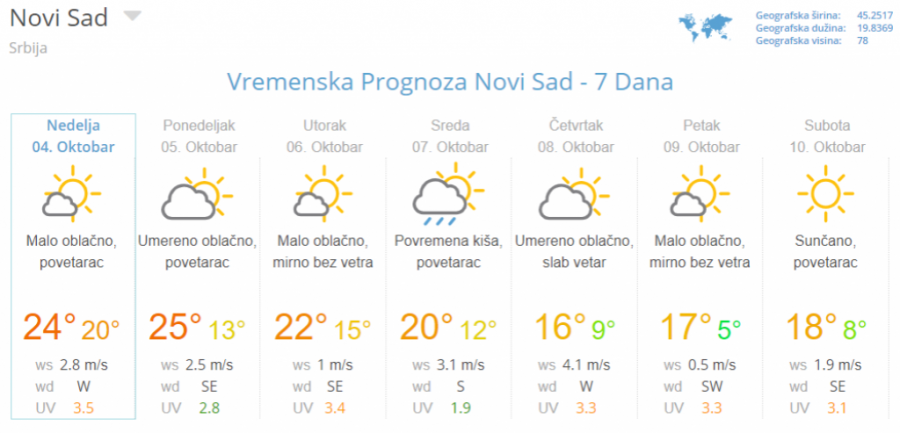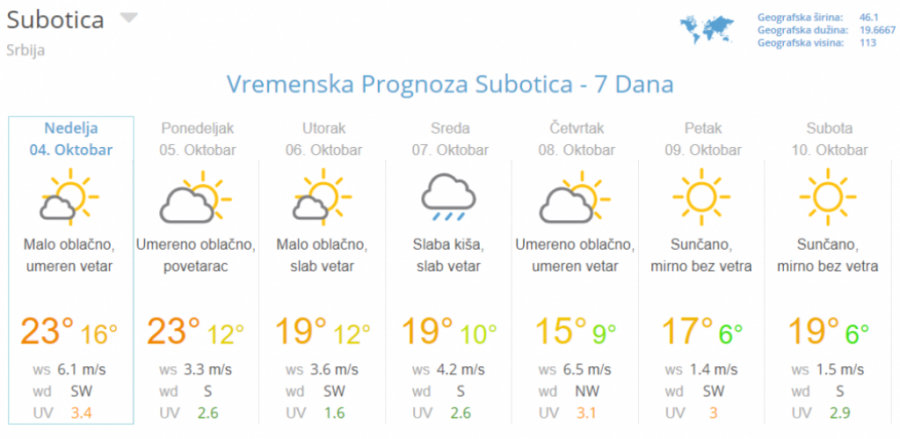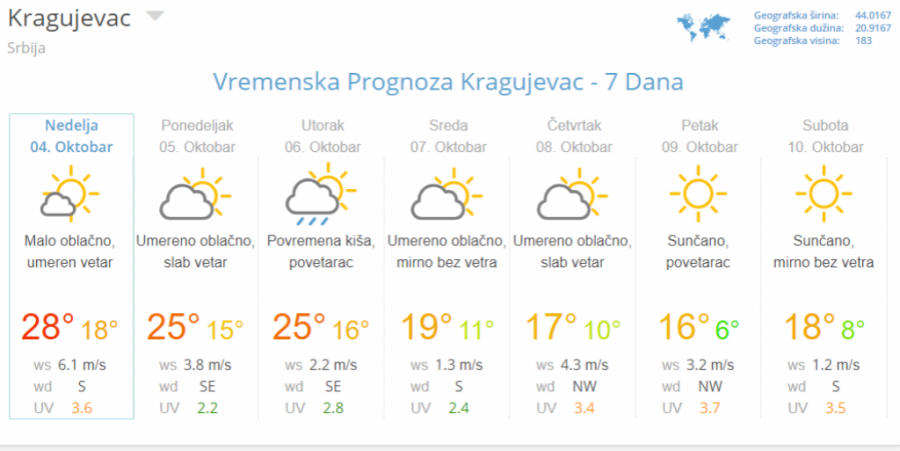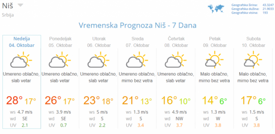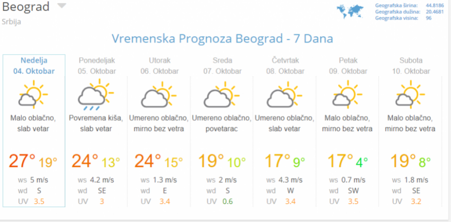 Od petka pa do oko 16. oktobra noći i jutra sveži uz pojavu magle, ali bez mraza. Tokom dana pretežno sunčano i toplo, ali verovatno bez velikog temperaturnog odstupanja od proseka uz maksimume u opsegu od 18 do 25 stepeni Celzijusa.