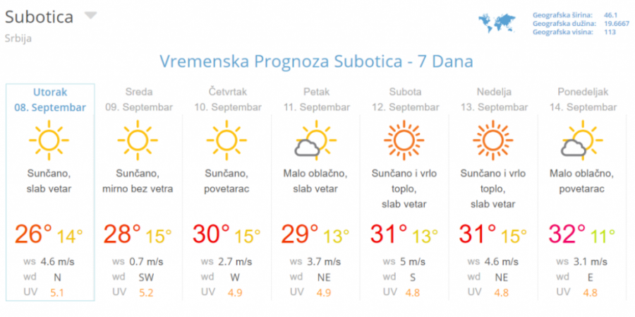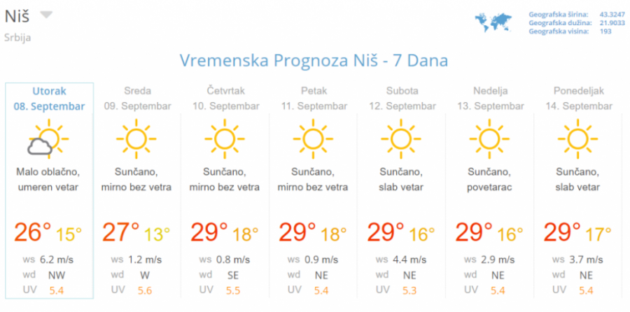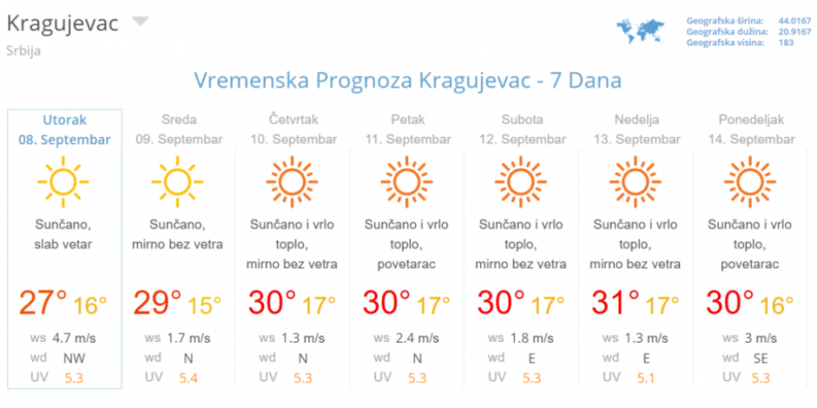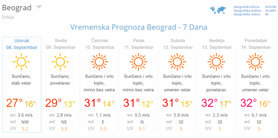 U Srbiji danas jutro vedro i sveže, u dolinama i kotlinama i sa maglom. Tokom dana sunčano i toplo. Duvaće slab do umeren severni i severoistočni vetar. Minimalna temperatura od 10 do 18°C, maksimalna dnevna od 27 do 30°C.