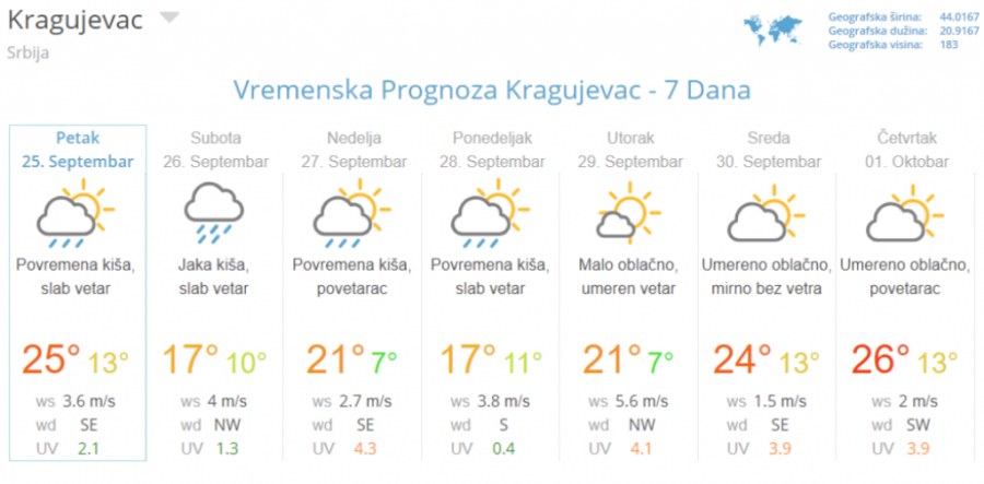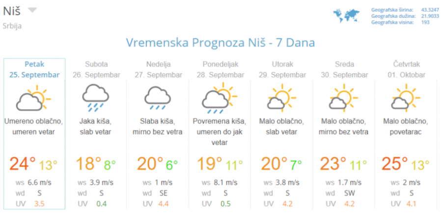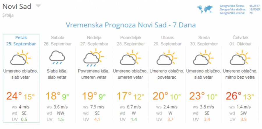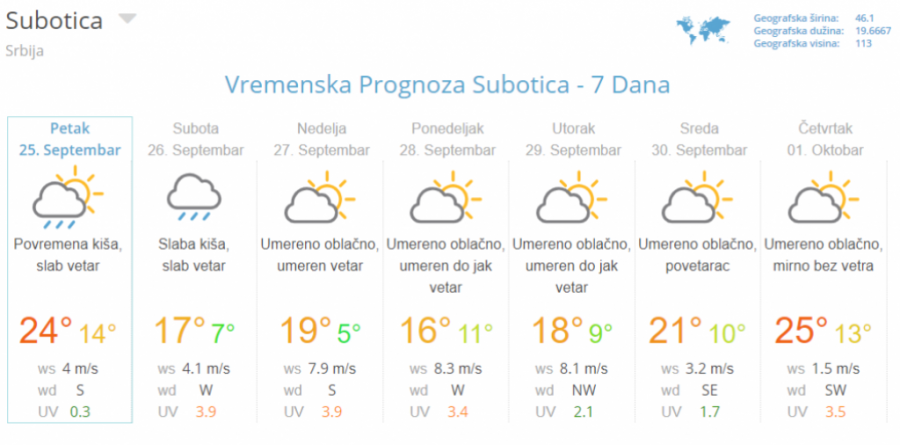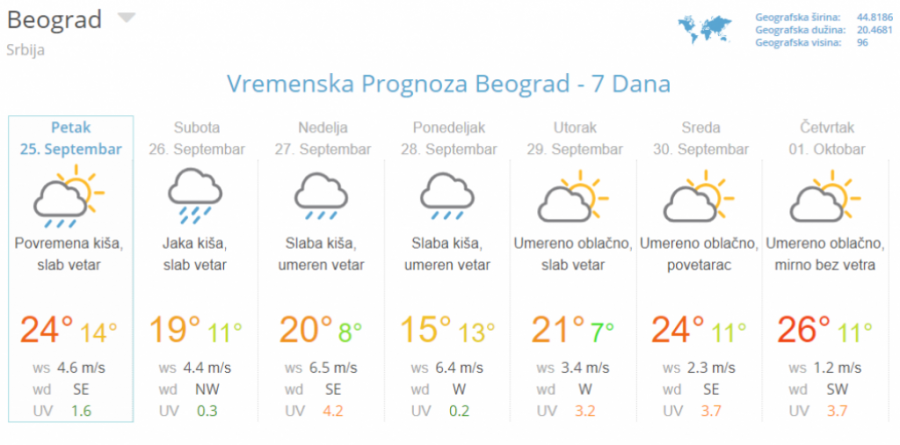 Na severu i zapadu Srbije u petak umereno do potpuno oblačno. Na jugu i istoku biće pretežno sunčano, uz povećanje oblačnosti prema kraju dana. Duvaće umeren do pojačan, povrmeneo i jak južni i jugozapadni vetar. Minimalna temperatura od 12 do 18°C, maksimalna dnevna od 27 do 31°C. U toku večeri i noći na krajnjem severu pljuskovi sa grmljavinom.