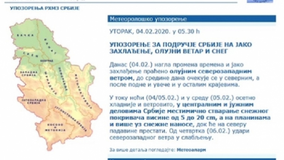 - Nagla promena vremena i jako zahlađenje praćeno olujnim severozapadnim vetrom do sredine dana očekuje se u severnim, a posle podne i uveče i u ostalim krajevima - stoji u upozorenju Republičkog hidrometeorološkog zavoda (RHMZ).