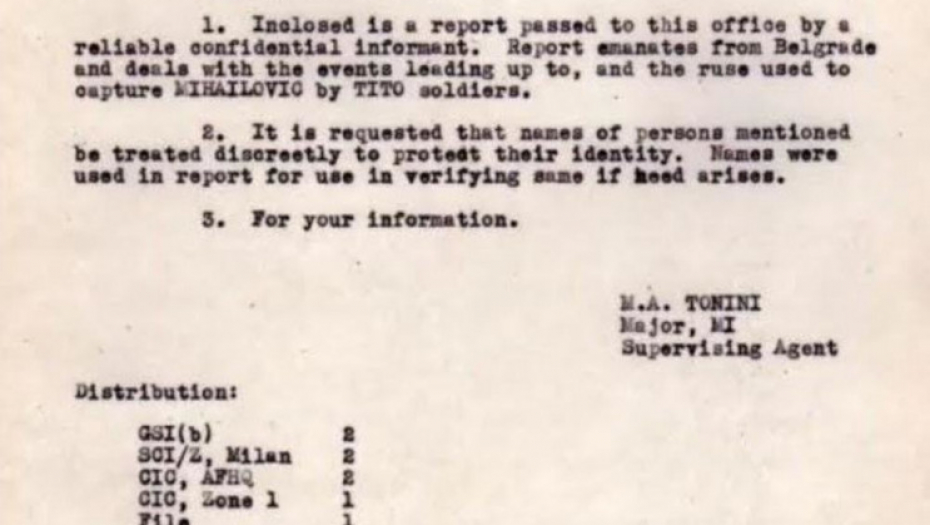 "Kontra obaveštajni korpus Milano bataljon, zona 3 APO 512 1 Jun 1946 PREDMET: Hvatanje generala Draže Mihailovića. ZA: GSI (b), 3 Okrug, CMF 1. U prilogu je izveštaj koji je ovoj kancelariji preneo pouzdani poverljivi informator. Izveštaj potiče iz Beograda i bavi se događajima koji su doveli do toga i putanjom kojom su Mihailovića zarobili Titovi vojnici. 2. Zahteva se da se sa navedenim osobama postupa diskretno kako bi se zaštitio njihov identitet. Imena koja su u izveštaju korišćena za potvrdu su ista ako se ukaže potreba 3. Za vaše informacije. M.A. TONINI Major, MI Nadzorni agent Dostaviti: GSI (b) 2 SCI/Z, Milano 2 CIC, AFHKU 2 CIC, Zona 1 1 Arhiva 1.