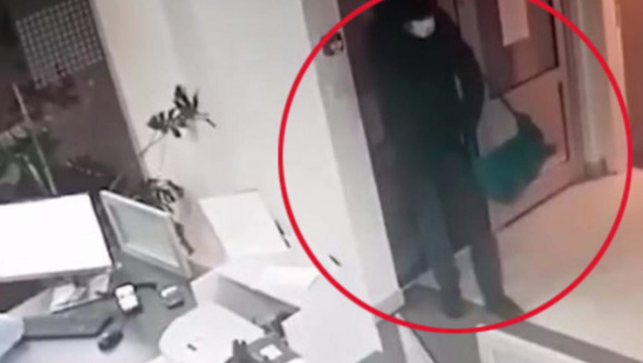 Na društvenim mrežama se pojavio snimak nadzorne kamere na kome se vidi kako muškarac sa zaštitnom maskom i plavim rancem u rukama ulazi u ekspozituru.