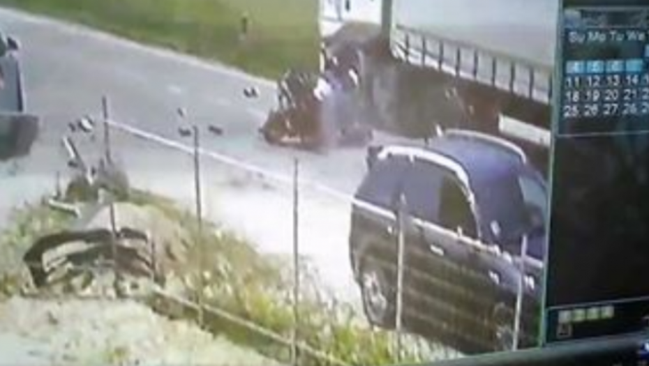 Društvenim mrežama kruži snimak jezivog sudara na kome se vidi kako motorista udara u automobil i od siline udarca izleće preko motora i pada na put.