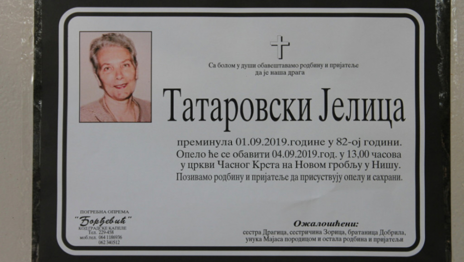 Dvadestešestogodišnji V.G. uhapšen je pod sumnjom da je izvršio teško ubistvo pošto postoji osnov sumnje da je proteklog vikenda ubio osamdestdvogodišnju baku Jelice Tatarovski zvane Vera iz Niša.