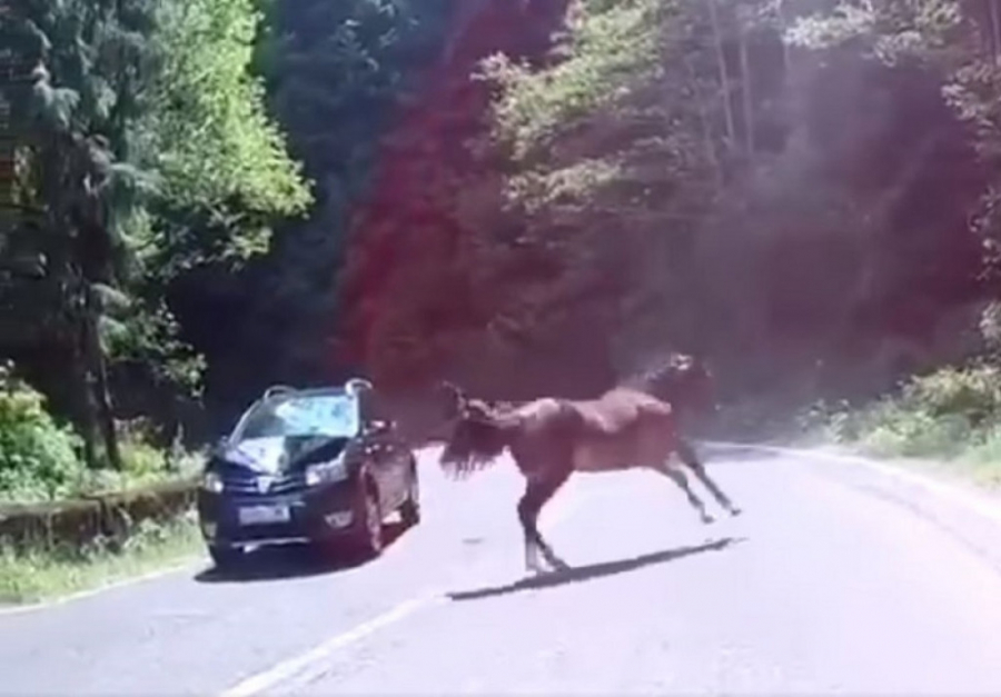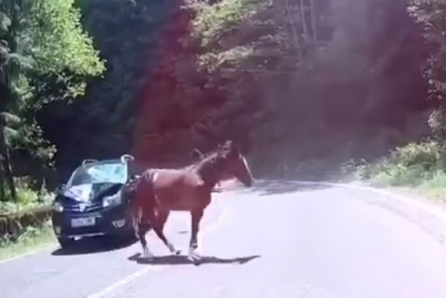 Neko iz drugom automobila, koji se kretao u suprotnoj traci, telefonom je snimao nesvakidašnji prizor trćanja konja po putu na kom se odvija saobraćaj, ne sluteći da će zabeležiti kako drugo vozilo udara u konja.
