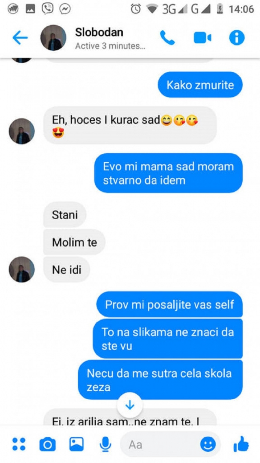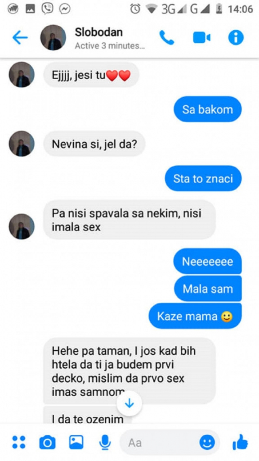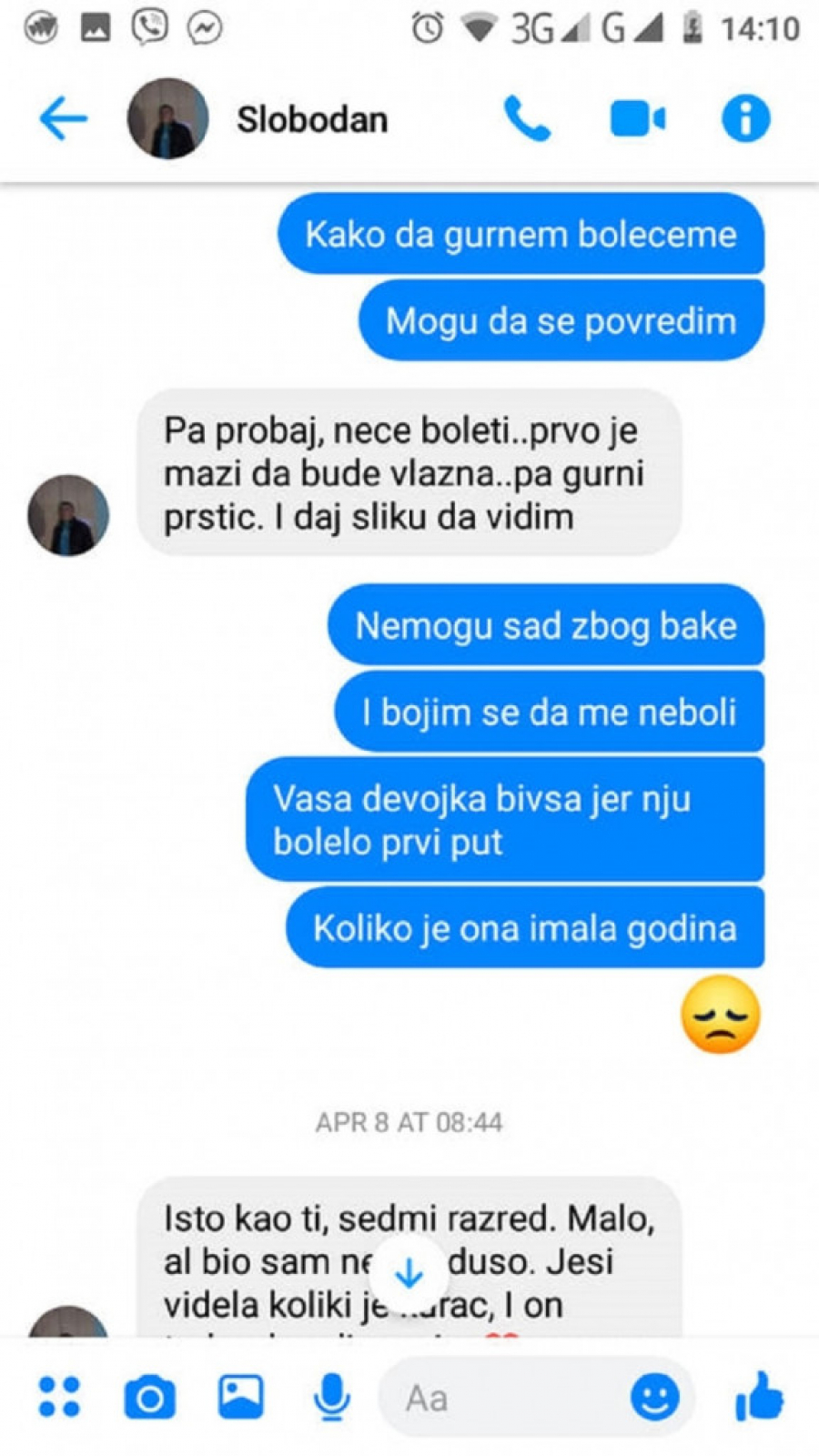 Devojčica ga je pitala da li je "njegovu bivšu devojku bolelo prvi put, i koliko je imala godina", da bi on napisao "isto kao ti, sedmi razred. malo je bolelo, bio sam nežan. Jesi li videla koliki je ku*ac?" - pisao joj je.