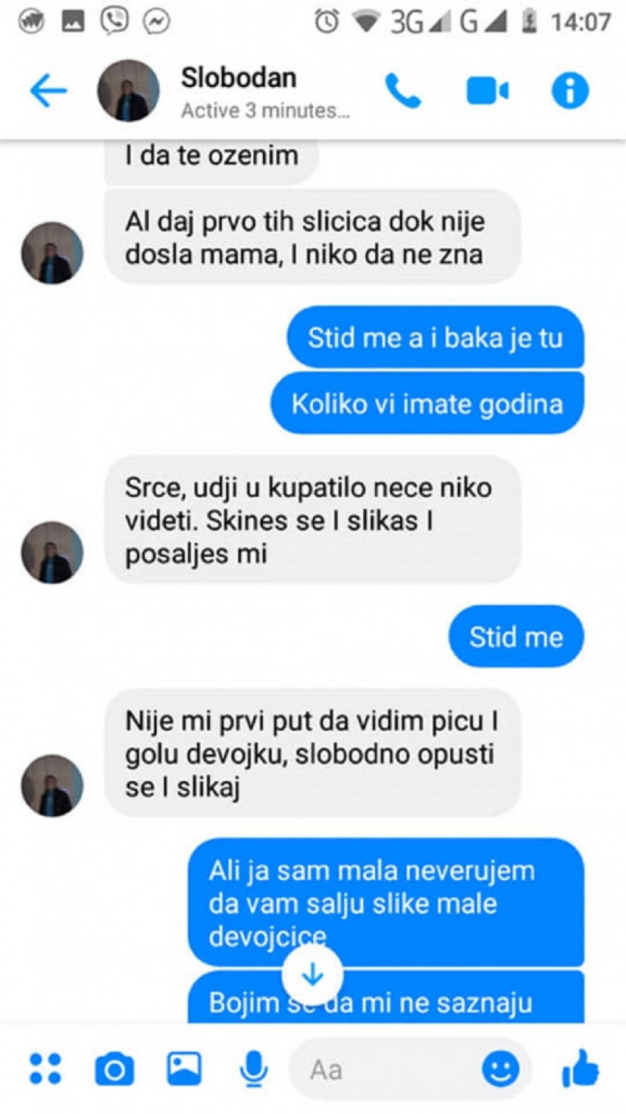 Od devojčice je, iako je znao da je maloletna, tražio golišave fotografije. Ispitivao ju je i da li ima oca, da li su njeni razvedeni, i insistirao na tome da ona treba da se uda za njega, da mu rodi dete, ali da mu pre upoznavanja pošalje gole slike.