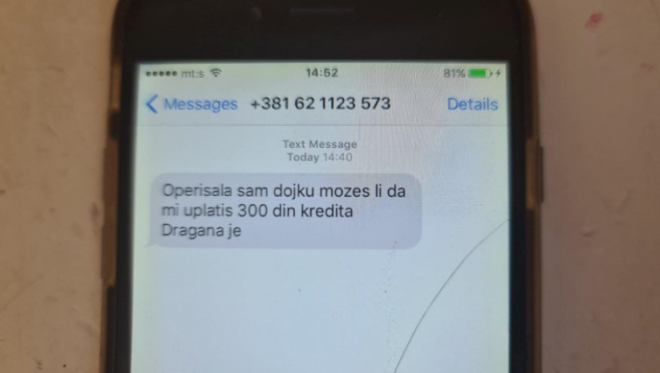 - Operisala sam dojku. Možeš li da mi uplatiš 300 dinara kredita. Dragana je - glasi SMS poruka.