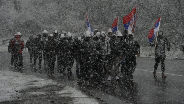 OVO MOGU SAMO SRBI SA KiM KOJI SU PEŠKE KRENULI ZA BEOGRAD! Dok sneg veje, oni ne ispuštaju zastavu Srbije! (FOTO)