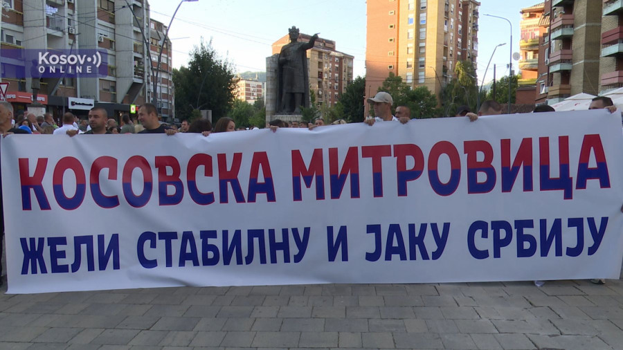 Okupljeni građani nosili su transparent „Kosovska Mitrovica želi stabilnu i jaku Srbiju“.