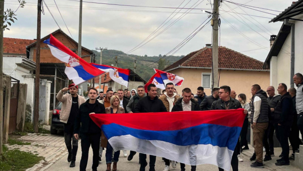 Srbi iz opštine Novo Brdo, iz mesta Gornje Kusce u velikom broju, zajedno su krenuli na glasanje a sa sobom na čelu kolone nose srpsku trobojku.