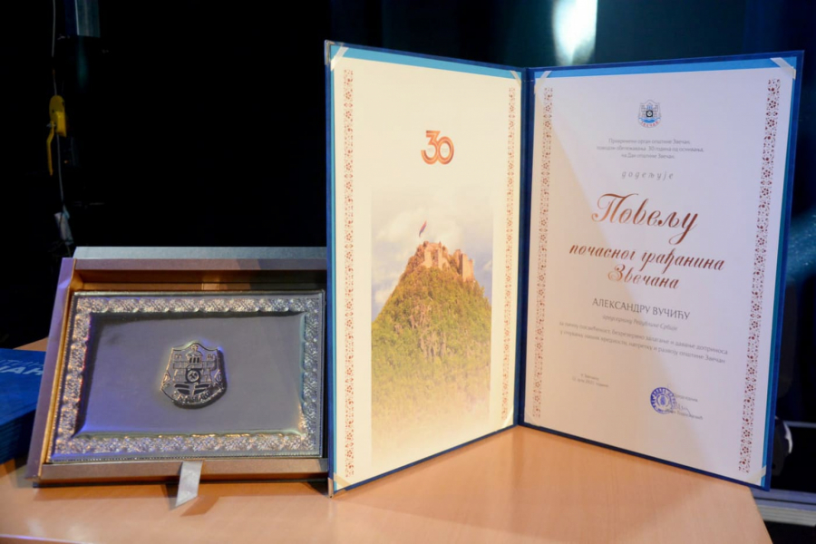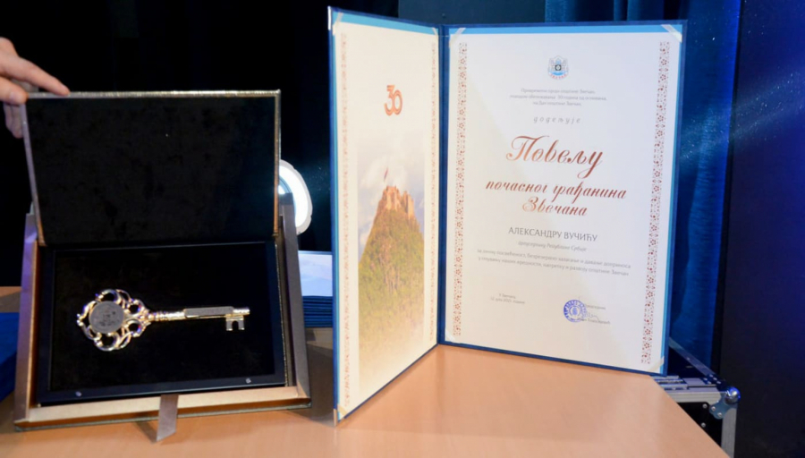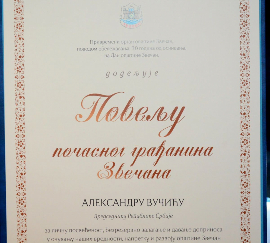 Kako saznaje Tanjug, to će biti objavljeno na svečanosti povodom Dana opštine Zvečan, a plaketu i ključ grada Zvečan u Vučićevo ime primiće direktor Kancelarije za KIM Petar Petković.