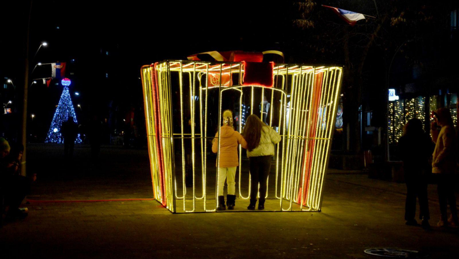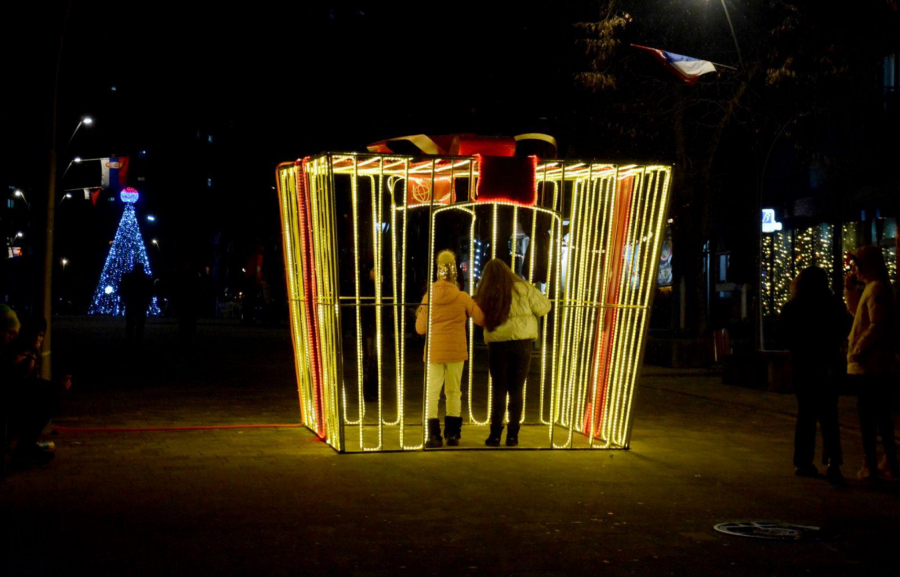Građani Kosovske Mitrovice vidno uživaju u prazničnoj idili dok prave fotografije pored velikog poklona i jelke.
