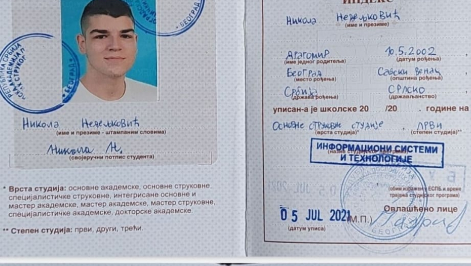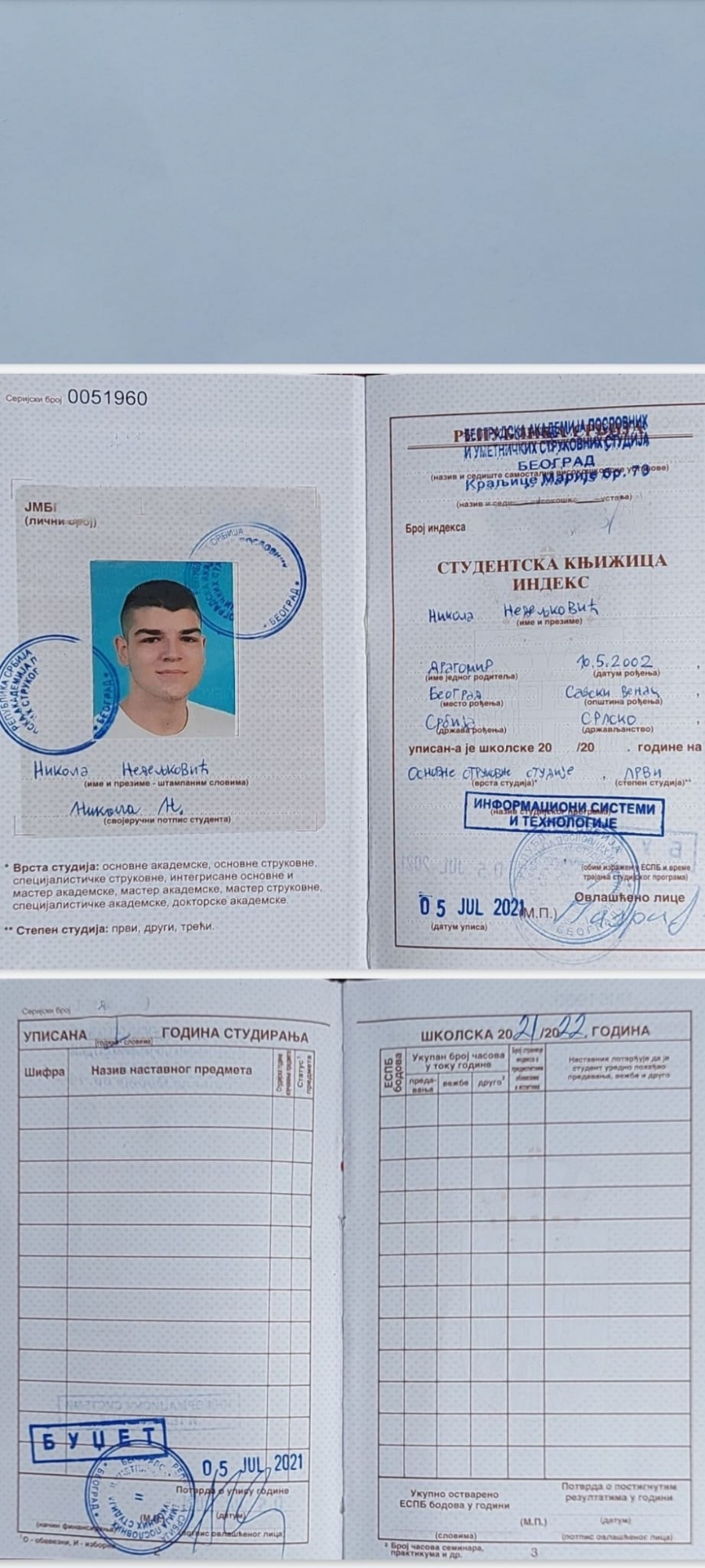Kako se može videti u njegovom indeksu, on je student prve godine Beogradske akademije poslovnih i umetničkih studija i studije je upisao na budžetu, smeru za informacione tehnologije. Zbog lažnih optužbi koje mu pakuju i zatvorske kazne, Nikola će izgubiti godinu studija.