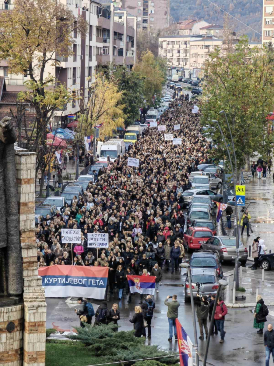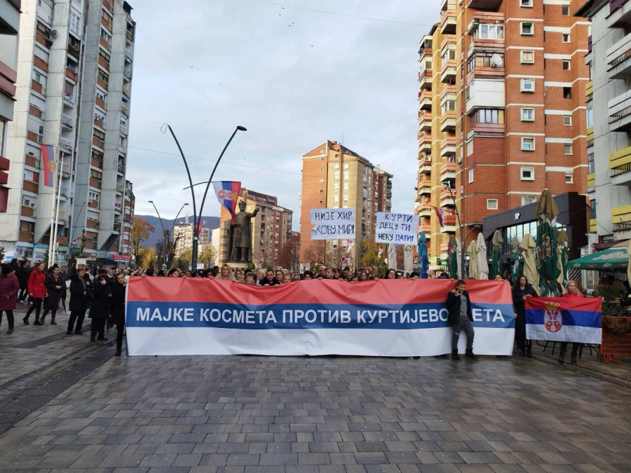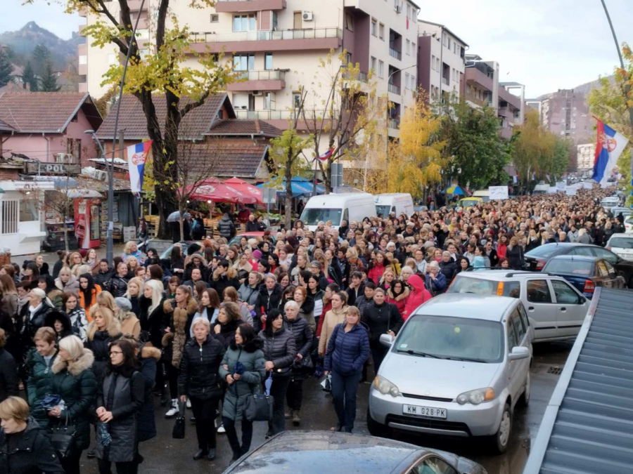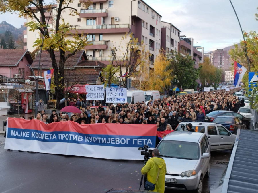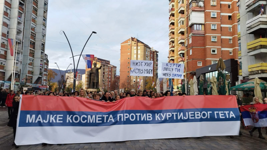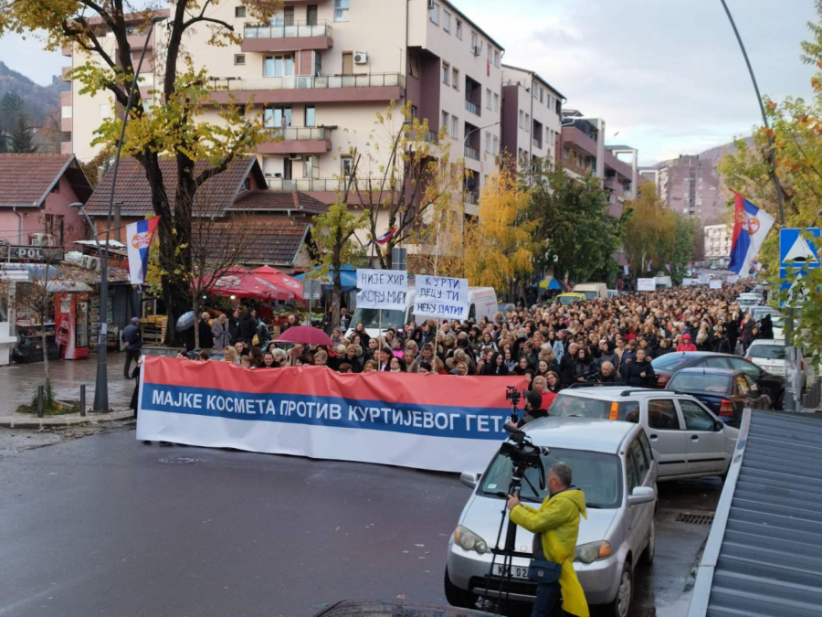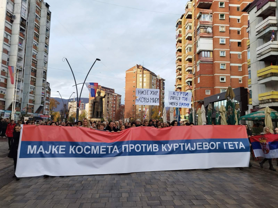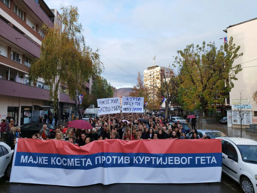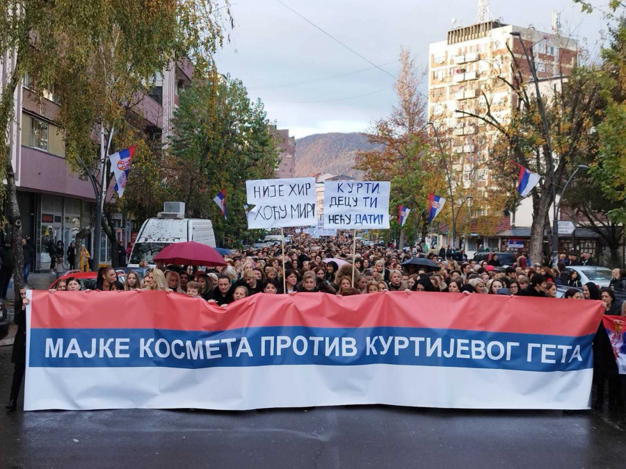 Iako pada kiša oko 5.000 žena je izašao na ulice. Povorku predvodi velika srpska zastava , koja na sebi ima slogan: „Majke Kosmeta protiv Kurtijevog geta“.
