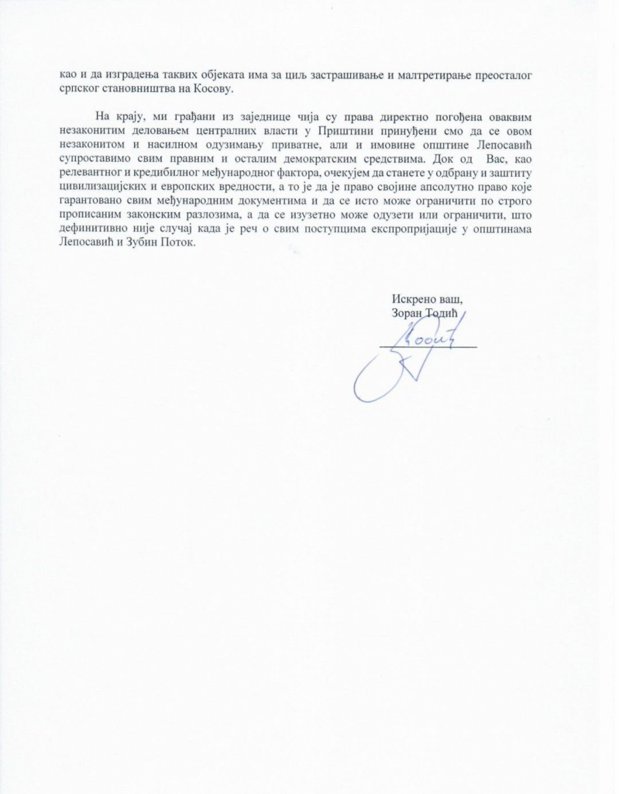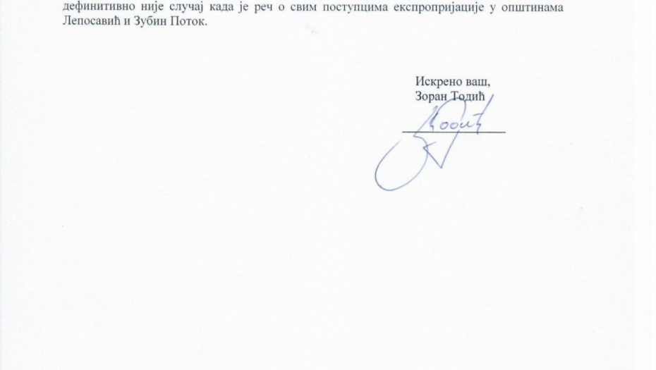Nekadašnji gradonačelnik Leposavića Zoran Todić uputio je pismo ambasadorima zemalja Kvinte, šefovima Misije EU na Kosovu i Metohiji, UNMIK-a, OEBSA, Euleksa, kao i komandantu Kfora u vezi odluke Vlade u Prištini o eksproprijaciji zemljišta na severu Kosova čiji su vlasnici Srbi, koja se nalazi na teritoriji te opštine.