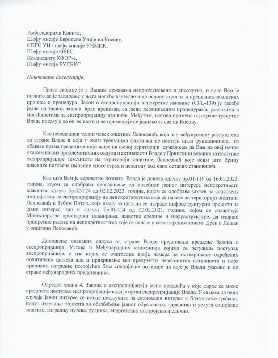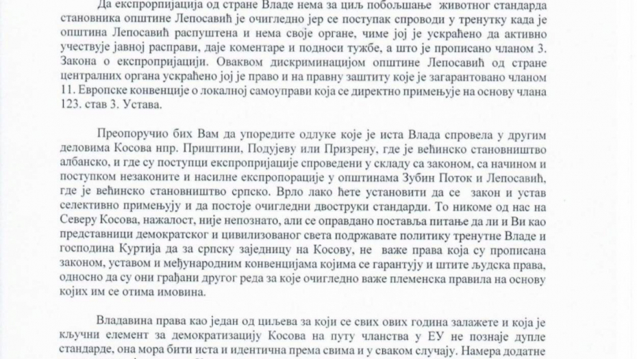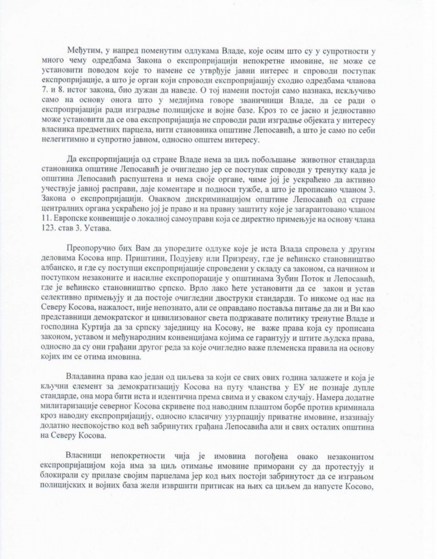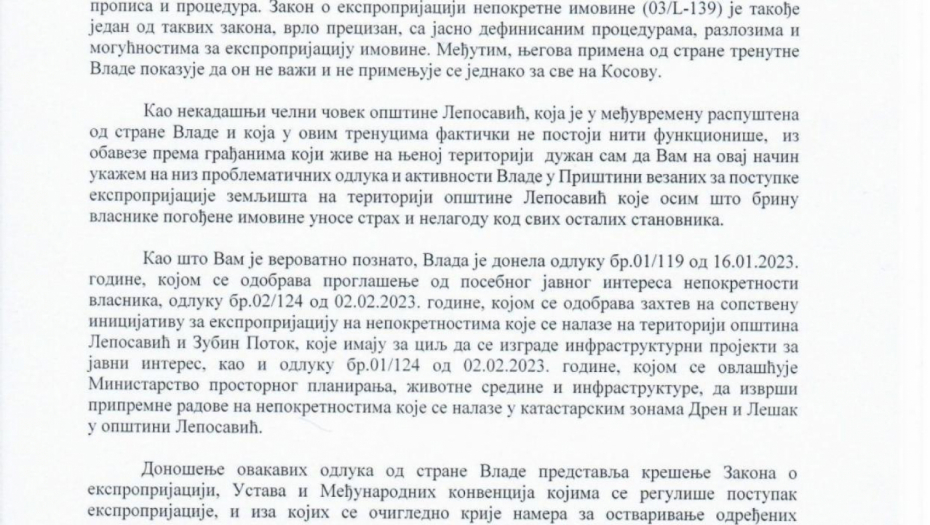 Dodaje da je kao nekadašnji čelni čovek opštine Leposavić, koja je u međuvremenu raspuštena od strane Vlade u Prištini i koja u ovim trenucima faktički ne postoi niti funkcioniše, iz obaveze prema građanima koji žive na njenoj teritorii dužan da na ova način ukaže na niz problematičnih odluka i aktivnosti Vlade u Prištini vezanih za postupke ekspropriaciіe zemlišta na teritorii opštine Leposavić koіe osim što brinu vlasnike pogođene imovine, po njegovim rečima unose strah i nelagodu kod svih ostalih stanovnika.