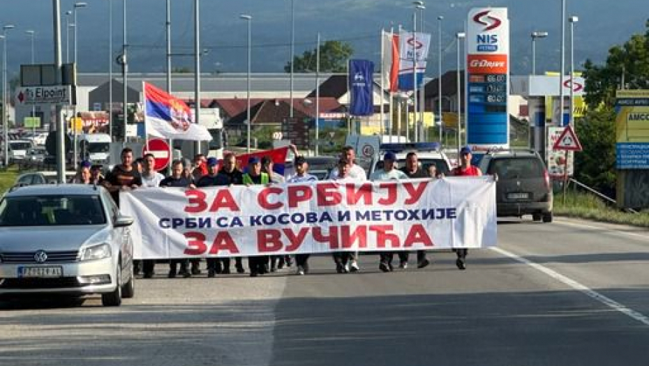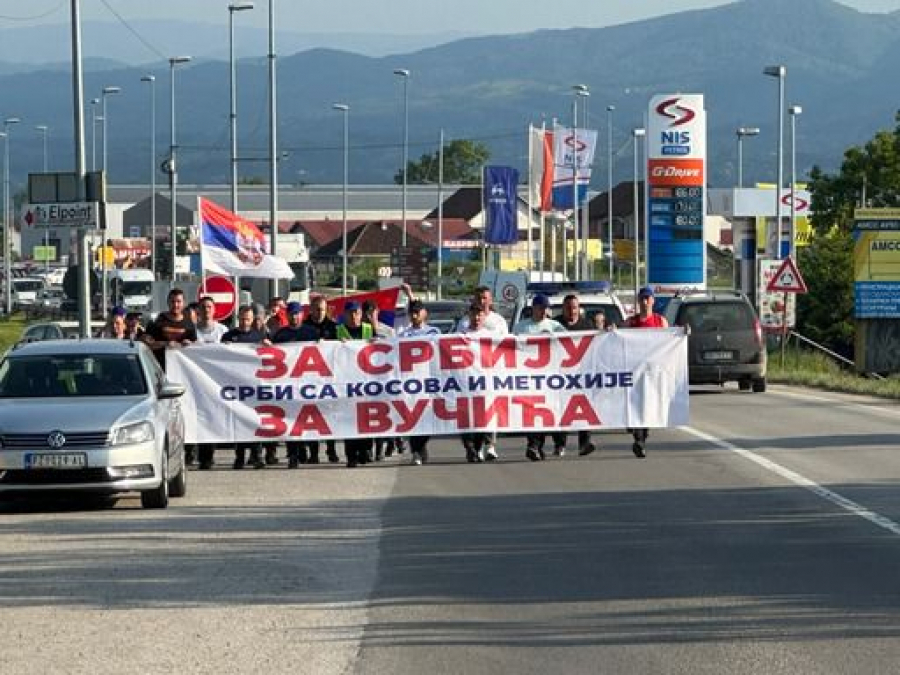 Srbi su do Čačka stigli, onako kako su i krenuli sa Kosova, sa velikim transparentom na čelu kolone „Srbi sa Kosova i Metohije za Srbiju za Vučića“.