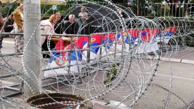 I ovog jutra pripadnici Kfora stoje iza ograde sa bodljikavom žicom na koju su zakačene srpske zastave.