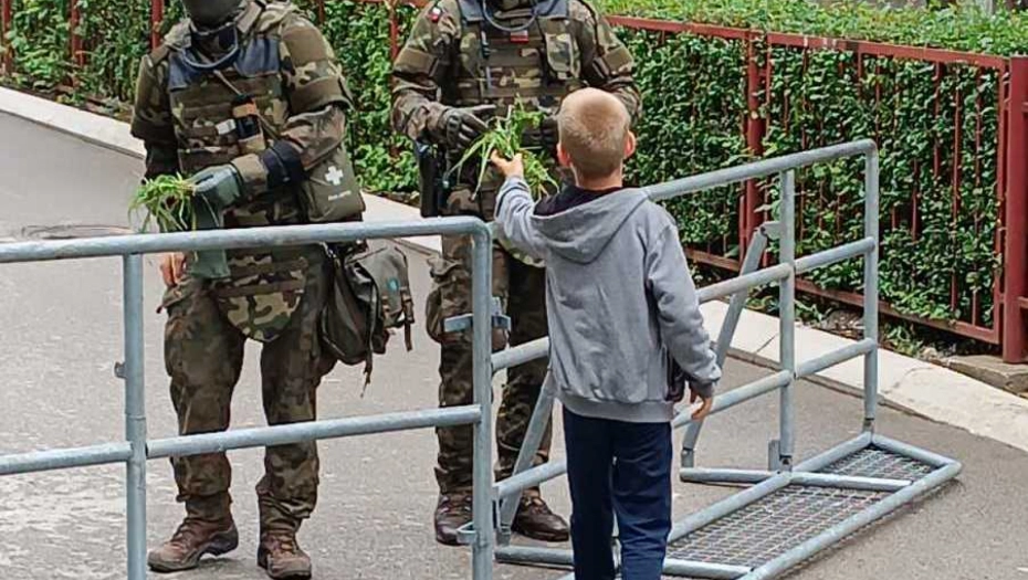 Zvečan: Dečak vojnicima KFOR-a poklanjao venčiće povodom Svete Trojice