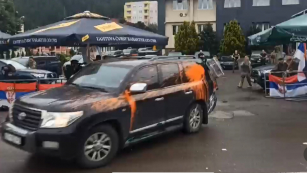 Okupljeni građani su ga ispratili zvižducima, a na vozilo u kojim je bio bačena je narandžasta farba.