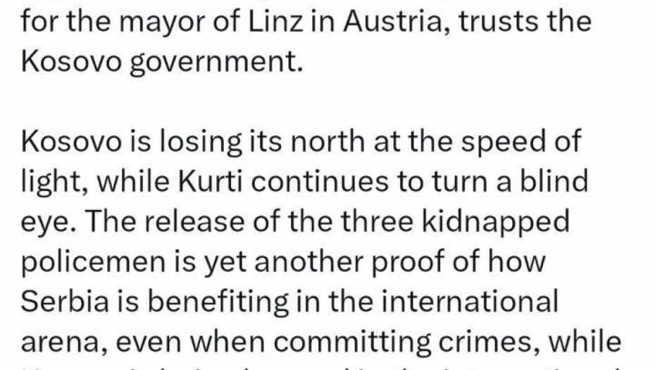 - Кosovo brzinom svetlosti gubi sever, dok Кurti nastavlja da zatvara oči. Oslobađanje trojice kidnapovanih policajaca je još jedan dokaz koliko Srbija ima koristi u međunarodnoj areni, čak i kada čini zločine, dok se Кosovu nanosi šteta u međunarodnoj areni čak i kada tvrdi da se bori protiv kriminala